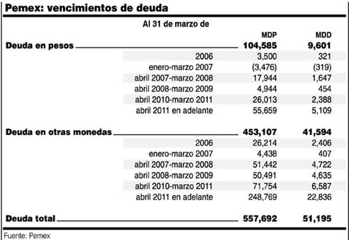 De los 51 mil 195 millones de dólares de deuda que actualmente arrastra Pemex, 9 mil 601 millones de dólares están contratados en pesos y 41 mil 594 millones de dólares están contratados en la divisa estadunidense. Pemex y sus organismos subsidiarios lograron aumentar ligeramente la duración promedio de la exposición de la deuda de la paraestatal de 3.6 años registrados en el primer trimestre de 2005 a 3.8 años al mismo lapso de 2006.