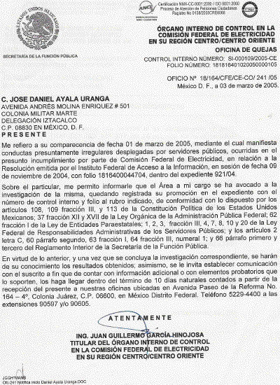 OFICIO N° 18/164/CFE/CE-COI 241 /05