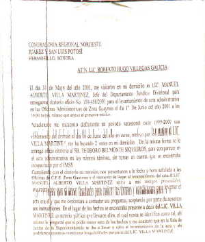 El 31 de Mayo del año 2001, me visitaron en mi domicilio el LIC. MANUEL ALBERTO VILLA MARTÍNEZ, Jefe del Departamento Jurídico Divisional para entregarme citatorio oficio No. 150-458/2001 para el levantamiento de acta administrativa en las Oficinas Administrativas de Zona Guaymas el día 1 de Junio del año 2001 a las 10:00 horas, mismo que anexo al presente escrito.