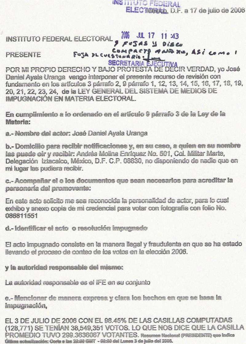 11:41 En la Oficialia de Partes del TRIFE me informan que efectivamente fue recibido el 18 de julio del 2006 a las 19:31 horas.