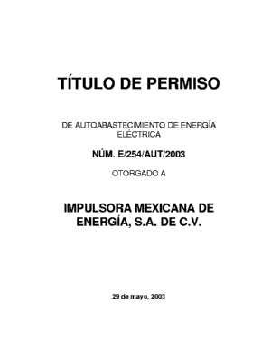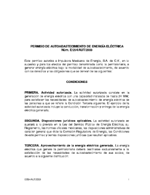 PERMISO DE AUTOABASTECIMIENTO DE ENERGÍA ELÉCTRICA Núm. E/254/AUT/2003 Este permiso autoriza a Impulsora Mexicana de Energía, S.A. de C.V., en lo sucesivo y para los efectos del permiso denominada como la permisionaria, a generar energía eléctrica bajo la modalidad de autoabastecimiento, de acuerdo con los derechos y las obligaciones que se derivan de las siguientes: CONDICIONES PRIMERA. Actividad autorizada. La actividad autorizada consiste en la generación de energía eléctrica con una capacidad instalada de hasta 24 MW, para satisfacer las necesidades de autoabastecimiento de energía eléctrica de las personas a que se refiere la Condición Tercera siguiente. El ejercicio de la actividad autorizada incluye la conducción, transformación y entrega de la energía eléctrica generada. SEGUNDA. Disposiciones jurídicas aplicables. La actividad autorizada se sujetará a lo previsto en la Ley del Servicio Público de Energía Eléctrica, su Reglamento, las normas oficiales mexicanas, las disposiciones administrativas de carácter general que dicte la Comisión Reguladora de Energía, las Condiciones de este permiso y demás disposiciones jurídicas que resulten aplicables. TERCERA. Aprovechamiento de la energía eléctrica generada. La energía eléctrica que genere la permisionaria deberá destinarse exclusivamente a la satisfacción de las necesidades de autoabastecimiento de sus socios, de acuerdo a la siguiente distribución: E/254/AUT/2003 1