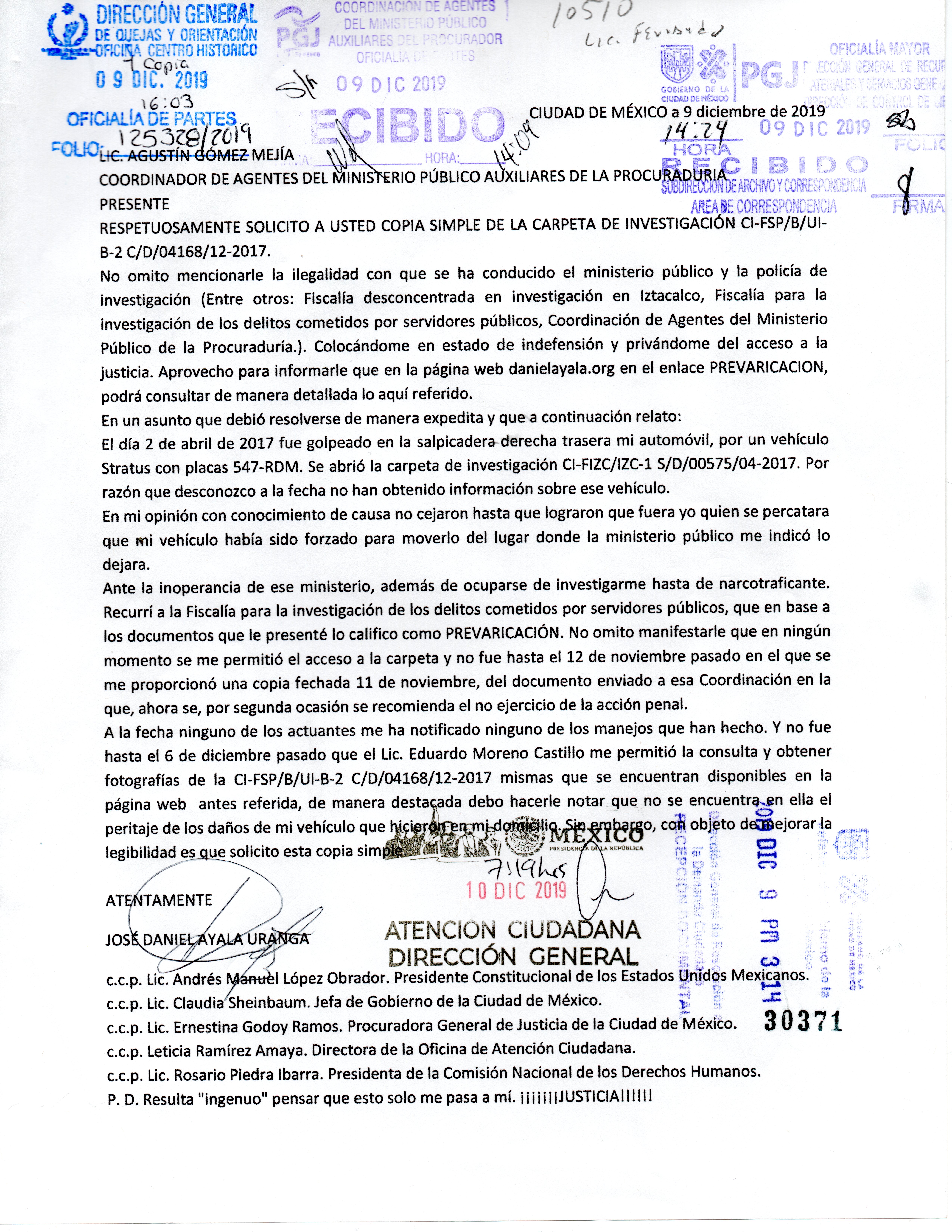 El 9 de diciembre de 2019 solicité copia simple de la carpeta de investigación CI-FSP/B/UI-B-2 C/D/04168/12-2017, ante la ilegibilidad de algunas de las fotografías. Que me impiden hacer un estudio detallado, de las tres C.I. ahí incluidas, sin embargo, deciden volver a negarme el acceso NUEVAMENTE , ya que no se me ha notificado ninguna de las actuaciones, hasta en tanto "se presente la promovente". "ESTO ES HASTA QUE NUEVAMENTE SE COLUDAN Y ME IMPIDAN EL ACCESO A LA JUSTICIA.""Notablemente el peritaje llevado a cabo en mi domicilio la noche del día que me fue entregado mi vehículo, así como el hecho de que el lugar donde deje mi vehiculo es tan próximo a las oficinas del ministerio público, que resulta poco creible que no se hayan dado cuenta de quien lo daño. Y la no investigación del vehículo que se encontraba estacionado adelante de mi.Y que en este momento se encuentra en proceso de abandono y daño justo frente al ministerio público. "