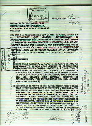 CON BASE A LA INFORMACIÓN QUE OBRA EN NUESTRO PODER, REFERENTE A LA SITUACIÓN QUE GUARDA ACTUALMENTE EL INCUMPLIMIENTO DEL PROVEEDOR SISTEMAS ELECTRICOS DE POTENCIA, AUTOMATIZACIÓN Y CONTROL, S.A. DE C.V. (SEPAC) ACERCA DEL CONTRATO NO. 98-1-0048-PEE, PARA EL SUMINISTRO, INSTALACIÓN Y PUESTA EN SERVICIO DE 66 SISTEMAS DE CONTROL LOCAL DE ESTACIÓN (SICLES), EN LA COMISIÓN FEDERAL DE ELECTRICIDAD, NOS PERMITIMOS EXPONERLE LO SIGUIENTE: