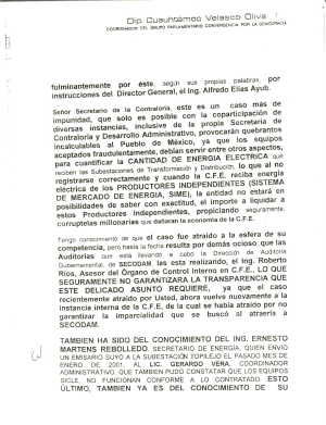 Tengo conocimiento de que ei caso fue atraido a la esfera de su competencia, pero hasta la fecha resulta por demás ocioso que las Auditorias que está llevando a cabo la Dirección de Auditoria guberna!nental de SECODAM, las esta realizando, el Ing, Roberto Rios, Asesor del Órgano de Control Interno en C.F.E., LO QUE SEGURAMENTE NO GARANTIZARA LA TRANSPARENClA QUE ESTE DELICADO ASUNTO REQUIERE, ya que el caso recientemente atraido por Usted, ahora vuelve nuevamente a la instancia interna de la C.F.E, de la cual se habia atraido por no garantizar la imparciaiidad que se buscó al atraerla a SECODAM.