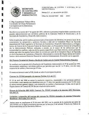 Me refiero a su escrito del 1° de agosto del 2001, referente a presuntas irregularidades cometidas en las pasadas administraciones por servidores públicos de la Comisión Federal de Electricidad y de la Secretaría de Contraloría y Desarrollo Administrativo.