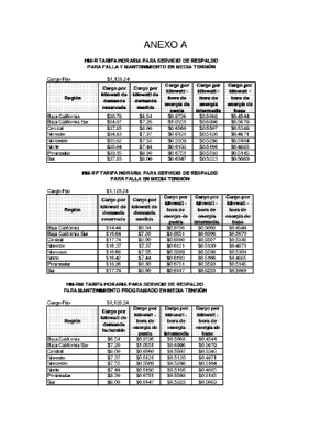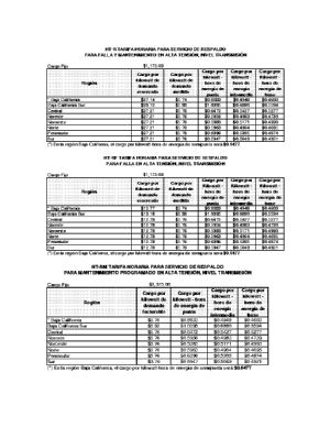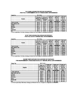 | Región | Cargo por kilowatt de demanda reservada | Cargo por kilowatt de demanda medida | Cargo por kilowatt-hora de energía de punta | Cargo por kilowatt-hora de energía intermedia | Cargo por kilowatt-hora de energía de base |