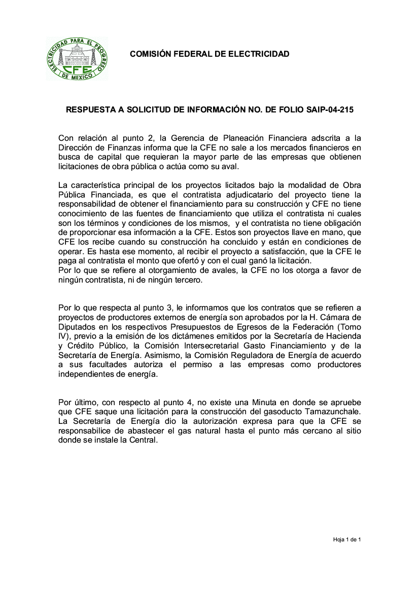 1.- "....Y es que hasta ahora, los inversionista privados que participan en la generación de energía eléctrica no asumen verdaderos riesgos; sus capitales están garantizados con la venta futura del servicio, Comisión Federal de Electricidad (CFE) sale a los mercados financieros en busca del capital que requieren la mayor parte de las empresas que obtienen licitaciones en obra pública o, actúa a como su aval."
